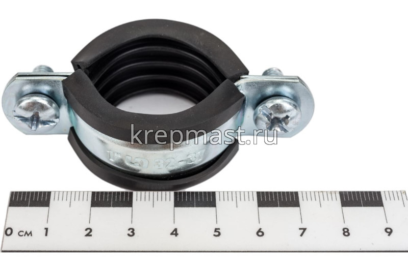Хомут сантехнический с гайкой 32-35 мм представляет собой две металлические пластины, соединенные по краям регулировочными винтами м5 и резиновым уплотнителем. К хомуту приварена гайка м8 с метрической резьбой. Диаметр обжима трубы составляет от 32 до 35 мм. Изготавливается из оцинкованной стали толщиной 1 мм.