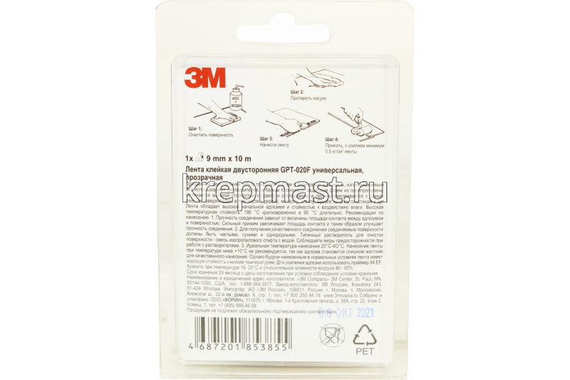 Скотч Двухстороннмй ЗМ 9мм х 10м прозрачный имеет толщину 200 микрон. Обладает модифицированным акриловым адгезивом, который изготавливают без использования растворителей, а также белым плёночным защитным слоем из полипропилена с логотипом. Изделие отличается высокой стойкостью к сдвигу и отслаиванию, прочно приклеивается к самым разным поверхностям. Отлично подходит для склеивания материалов с высокой поверхностной энергией, а также некоторых материалов с низкой поверхностной энергией (нержавеющая сталь, поликарбонат, алюминий, АБС-пластик, полипропилен и стекло).