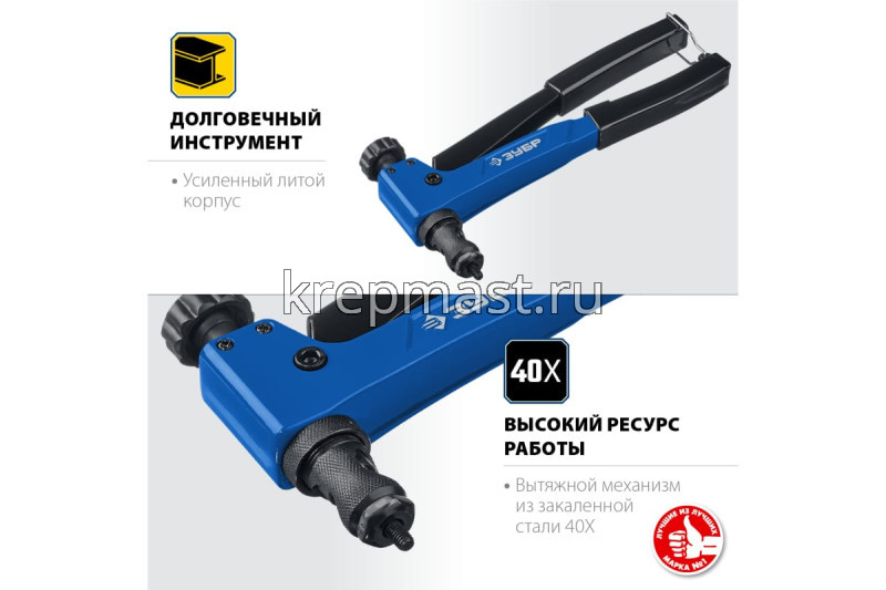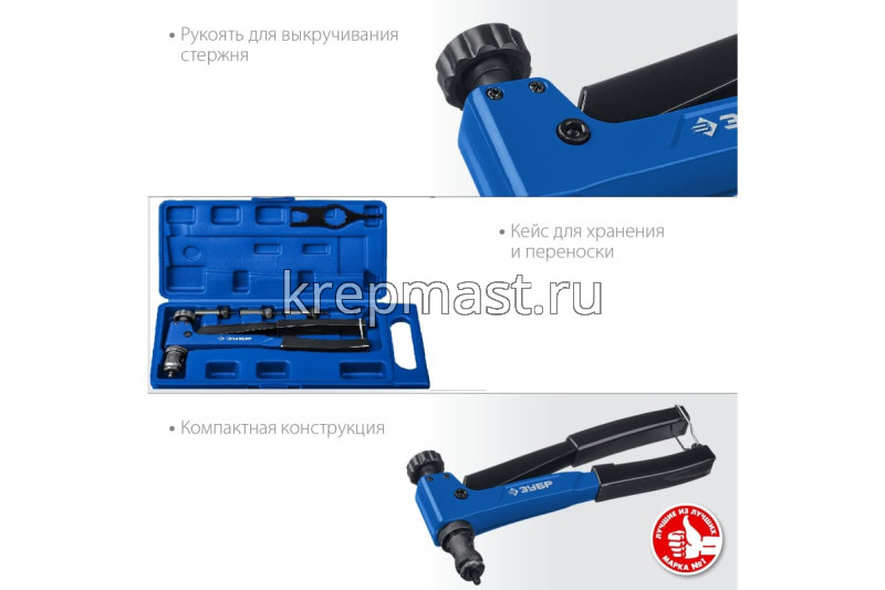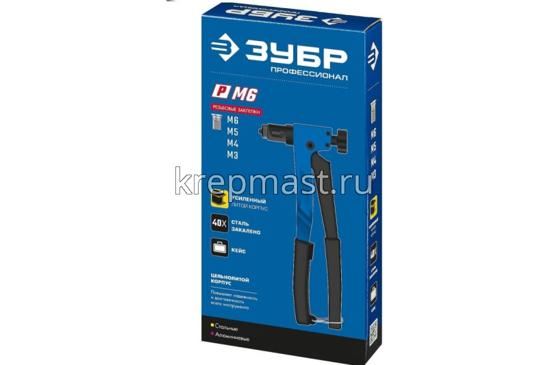 Заклепочник ЗУБР Р-М6 двуручный для резьбовых заклепок М3, М4, М5, М 6мм в интернет-магазине «Мастер Крепежа» по цене 3862 руб. Более 10 наименований товаров в наличии в категории ЗАКЛЕПОЧНИКИ. Купить заклепочник зубр р-м6 двуручный для резьбовых заклепок м3, м4, м5, м 6мм в Чистополе выгодно Вы можете on-line на нашем сайте, или отправив заявку по почте, а также по телефону или в пункте выдачи компании г. Казань, ул. Татарстан, 9, магазин "Мастер Крепежа". Доставка по Республике Татарстан и другие регионы РФ.