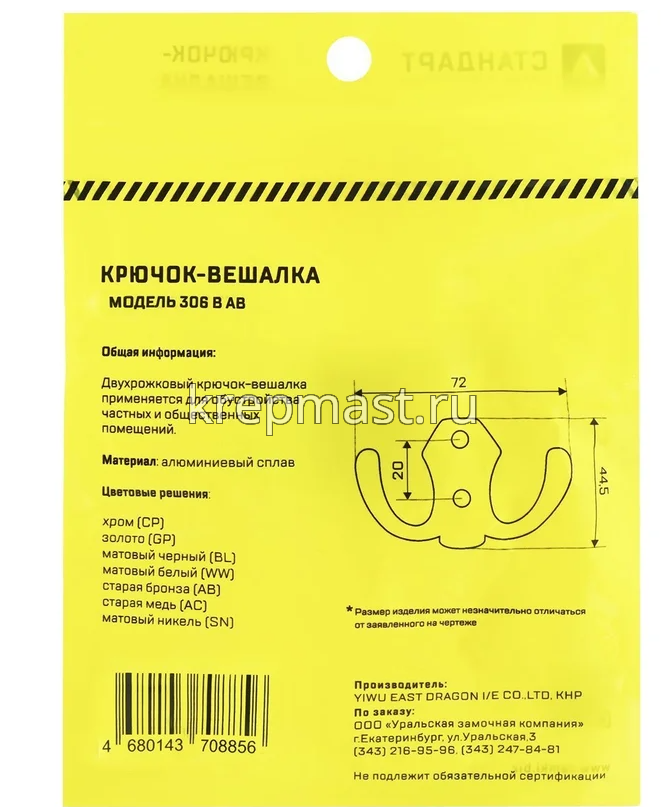Крючок 306 В СР хром СТАНДАРТ в интернет-магазине «Мастер Крепежа» по цене 120 руб. Более 12 наименований товаров в наличии в категории Крючок-вешалка. Купить крючок 306 в ср хром стандарт в Чистополе выгодно Вы можете on-line на нашем сайте, или отправив заявку по почте, а также по телефону или в пункте выдачи компании г. Казань, ул. Татарстан, 9, магазин "Мастер Крепежа". Доставка по Республике Татарстан и другие регионы РФ.