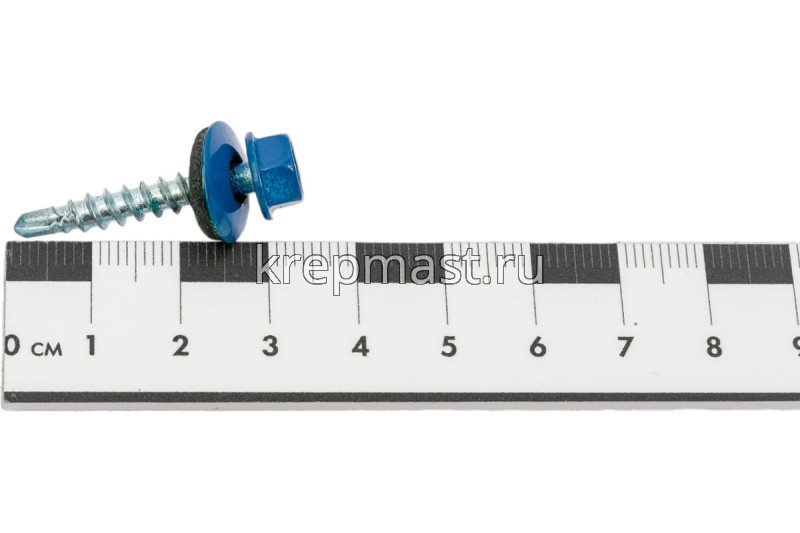 Кровельный саморез окрашенный с шайбой и резиновой прокладкой EPDM DIN 7504 4,8 х 29 по дереву RAL 5005 (цвет ярко-синий) - представляет из себя саморез с шестигранной головкой, фланцем и резиновой прокладкой для эффективного прижатия листового металла к основанию.