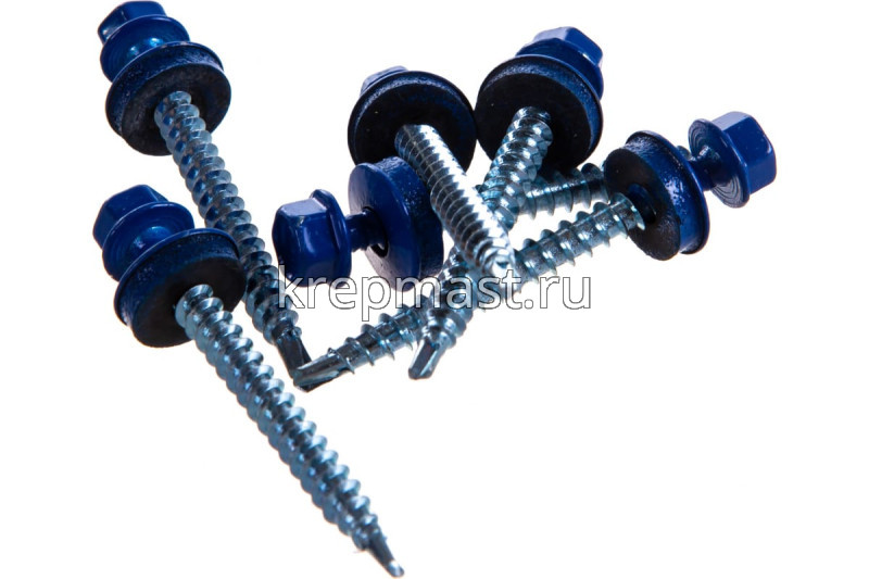 Кровельный саморез окрашенный с шайбой и резиновой прокладкой EPDM DIN 7504 4,8 х 51 по дереву RAL 5010 (цвет темно - синий) - представляет из себя саморез с шестигранной головкой, фланцем и резиновой прокладкой для эффективного прижатия листового металла к основанию.