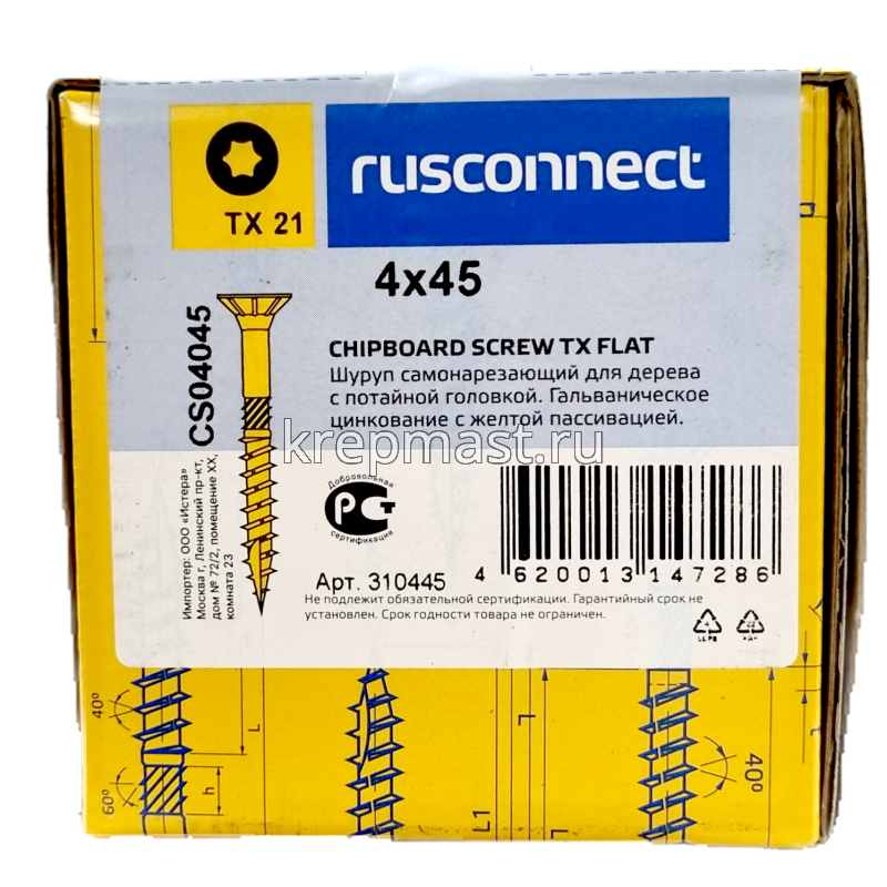 Шуруп с/нарез. для дерева потай 4,0х 45 Тх в интернет-магазине «Мастер Крепежа» по цене 8 руб. Более 43 наименований товаров в наличии в категории Шурупы КОНСТРУКЦИОННЫЕ для дерева. Купить шуруп с/нарез. для дерева потай 4,0х 45 тх в Чистополе выгодно Вы можете on-line на нашем сайте, или отправив заявку по почте, а также по телефону или в пункте выдачи компании г. Казань, ул. Татарстан, 9, магазин "Мастер Крепежа". Доставка по Республике Татарстан и другие регионы РФ.