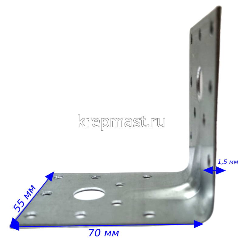 Крепежный усиленный уголок КР 4 70х70х55х1,5 предназначен для крепления деревянных конструкций (при монтаже каркасов стропильных систем). Уголок кп4 изготовлен из оцинкованной стали толщиной 1,5 мм. Усиленный уголок кр4 имеет дополнительное ребро жесткости для усиления его несущей способности.