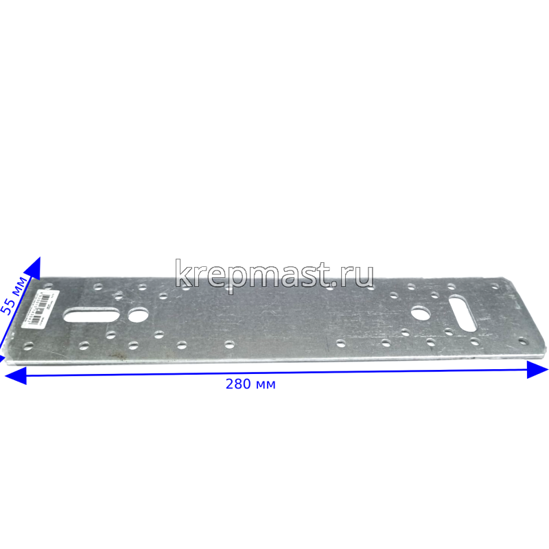 Крепежная пластина LP4 280x55x2,5мм применяется для соединения и упрочнения конструкций при помощи нескольких дюбелей, анкеров, саморезов.