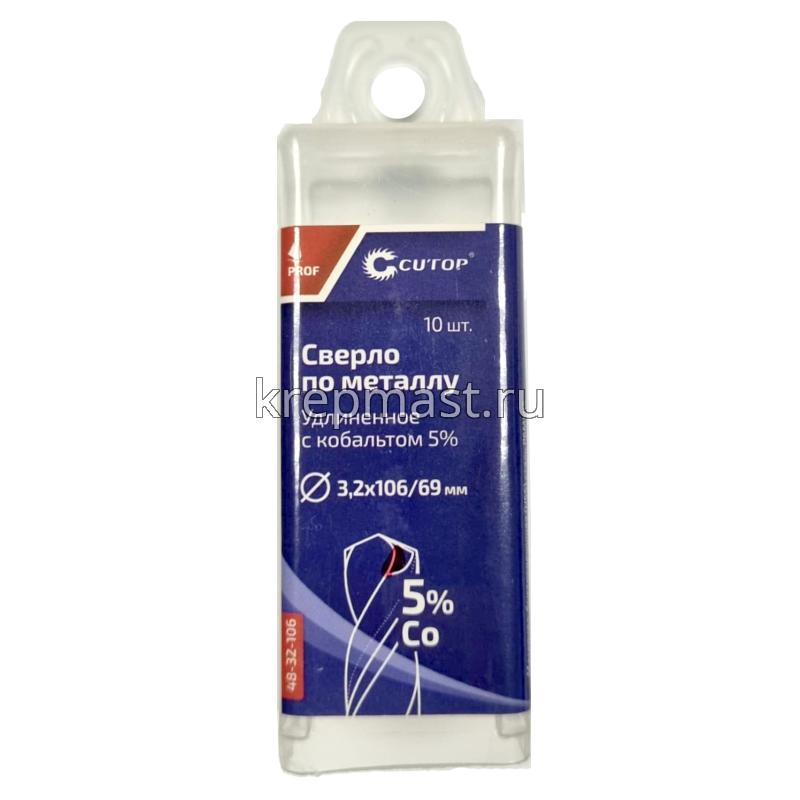 Удлиненное кобальтовое сверло по металлу М 3,2 x 106мм CUTOP изготовлено из быстрорежущей стали Р6Co5М5. Сверло шлифованное и имеет цилиндрический хвостовик. Подходит для сверления цветных металлов. Угол заточки при вершине — 135 градусов, а класс точности — А1.