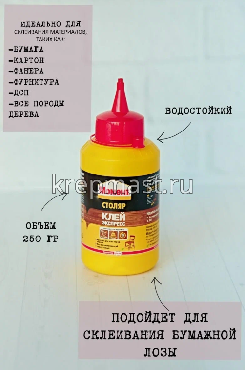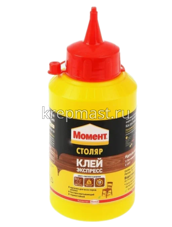 Клей Столяр Момент, 250 мл. предназначен для различных пород дерева. С его помощью склеивают ДСП, фанеру, шпон, ламинат, картон, фурнитуру, ткань, кожу, некоторые пластики. Шов получается высокопрочный и устойчивый к кратковременному воздействию воды (водостойкость D2). Используют, например, при сборке и ремонте мебели. Такой клей хранят при температуре от +5?С до +30?С, нужно беречь от мороза.